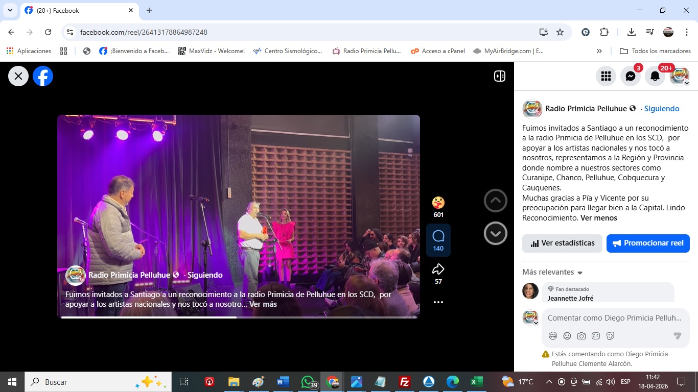 Fuimos invitados a Santiago a un reconocimiento a la radio Primicia de Pelluhue en los SCD, por apoyar a los artistas nacionales y nos tocó a nosotros, representamos a la Región y Provincia donde nombre a nuestros sectores como Curanipe, Chanco, Pelluhue, Cobquecura y Cauquenes. Muchas gracias a Pía y Vicente por su preocupación para llegar bien a la Capital. Lindo Reconocimiento.